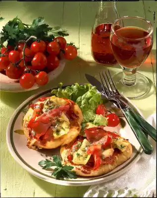 Bake in the preheated oven (electric cooker: 200 °C/ convection oven: 175 °C/gas: level 3) for 15-20 minutes. Wash parsley and chop finely except for a little bit. Arrange pizzas and sprinkle with chopped parsley. Garnish with lettuce, tomatoes and the rest of the parsley if desired.
