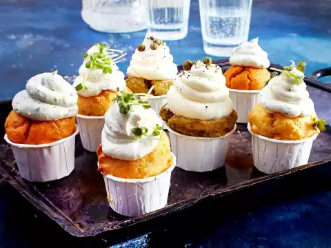 Pour the gorgonzola cream into a piping bag with a perforated spout and squirt onto the muffins. Sprinkle with cress, capers and pepper.