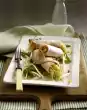 Peel the shrimps, down to the tail fin and remove the intestines. Peel the avocado half, cut into cubes and sprinkle with lemon juice. Clean and wash the salad, pluck into bite-sized pieces and drain. Peel onion and garlic. Chop the onion finely, press the garlic through a garlic press.