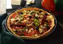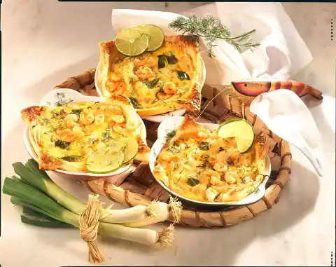 Defrost puff pastry at room temperature for about 30 minutes. In the meantime, peel and finely dice the onions. Clean, wash and cut the spring onions into rings. Heat oil in a pan, fry onions and sauerkraut for about 5 minutes, add spring onions, add 100 ml water and vinegar and braise for another 5 minutes. Season sauerkraut with salt, pepper and sugar. Stir the prawns into the sauerkraut.