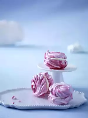 Beat the egg whites and lemon juice with the whisks of the hand mixer until stiff. Gradually add sugar and salt. Add the food colouring and fold in briefly to create a pink marbling. Pour the mixture into a piping bag with a large star-shaped spout. Line 2 baking trays with baking paper. Spray approx. 24 flat rosettes (3-4 cm Ø) on top