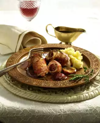 Fry the mini roulades in hot oil until they are firm all around. Fry the rosemary briefly. Add plums, 300 ml water and stock, bring to the boil and simmer for 3-4 minutes. Season sauce with salt, pepper, vinegar and 1/2-1 teaspoon sugar