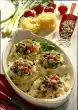 Drain the potatoes. Add butter and mash everything to puree. Season to taste with salt and pepper. Arrange everything, garnish with the rest of the herbs