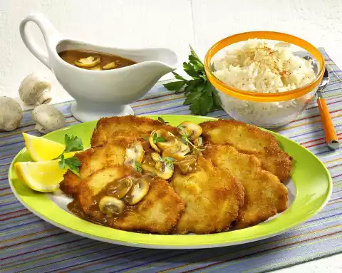 Put rice in boiling salted water and cook for 20 minutes. Season schnitzel with salt and pepper. Beat the egg. Turn escalopes first in flour, then egg and breadcrumbs. Clean mushrooms, rub with kitchen paper and cut into slices. Heat 1 teaspoon of oil in a saucepan. Fry the mushrooms for about 2 minutes.