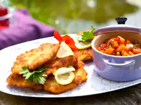 Beat the schnitzel very thinly between 2 layers of foil. Beat the eggs and season with salt and pepper. Turn escalopes one after the other first in flour, then egg and then breadcrumbs. Heat oil in a pan and fry the escalopes in portions at medium heat for about 5 minutes. Garnish with fresh parsley, flowers and lemon. Add dip