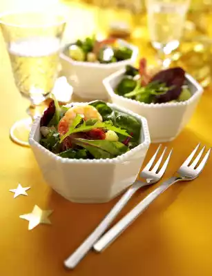 Wash the potatoes thoroughly and boil them in boiling water for about 15 minutes until soft. Peel the shrimps, except for the tail fin, and remove the intestines. Wash shrimps and pat dry. Heat 1 tablespoon of oil in a frying pan. Fry the prawns for 3-4 minutes over a high heat, turning them over, season with salt and pepper.