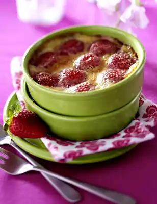 Divide the strawberries into 4 ovenproof bowls (each containing approx. 150 ml). Pour the dough over it and bake in the preheated oven (electric cooker: 200 °C/ circulating air: 175 °C/ gas: see manufacturer) for approx. 25 minutes.