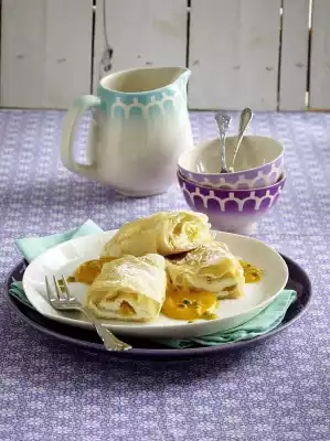 Process remaining strudel leaves, rusk crumbs, curd filling and mango cubes in the same way. Bake in the preheated oven (electric cooker: 200 °C/ convection oven: 175 °C/ gas: level 3) for 20-25 minutes, remove from the oven, let cool down for about 10 minutes