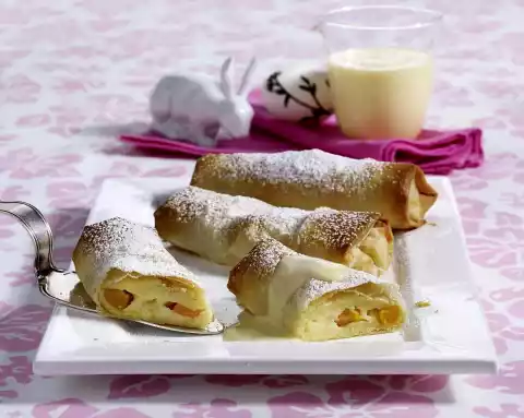 Boil 750 ml milk. Stir in semolina, lemon peel and 2 tablespoons of sugar and simmer for about 2 minutes while stirring. Separate the eggs. Mix egg yolks and 2 tablespoons of semolina, then stir into the remaining semolina. Beat egg whites until stiff, adding vanilla sugar and 1 tablespoon of sugar. First add the apricot slices, then the beaten egg white to the semolina. Unfold strudel leaves and brush 2 leaves with butter. Cover with 1 leaf and cut into 4 squares. Brush with butter and sprinkle the lower half with 1-2 teaspoons of sponge crumbs. Place about 3 tablespoons of semolina on the lower long side of each strudel leaf, leaving about 3 cm free at the edges. Fold the side edges 2-3 cm over the filling, then roll up relatively tightly from the long side. Place the strudel on a baking tray lined with baking paper and brush with butter.