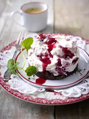 Mash the cherries a little with a fork. Stir mascarpone and sugar until smooth. Whip cream until stiff and fold in with the cherries. Spread the cream on the biscuit bases and spread loosely. Remove the rings and place the tartlets on plates. Drizzle with some cherry sauce, add the rest of the sauce. Serve decorated with lemon balm