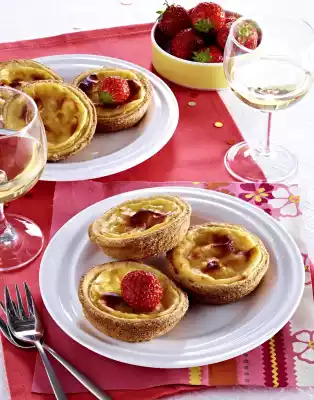 Pour the vanilla cream into the moulds. Bake in the preheated oven (electric cooker: 200 °C/ convection oven: 175 °C/ gas: see manufacturer) for 20 minutes. Reduce the temperature (electric oven: 175 °C/ convection oven: 150 °C/ gas: see manufacturer) and bake for another 10 minutes. Let cool down. Wash and clean the strawberries. Decorate flanges with them