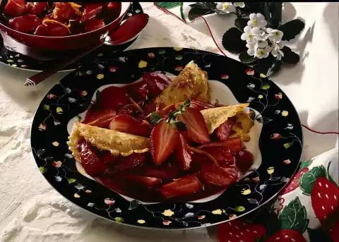 Mix milk, eggs, salt, a tablespoon of sugar and oil. Stir in the flour by the spoonful. Let the dough swell for 30 minutes. Wash the strawberries. Except for a few fruits to decorate, clean, halve or quarter.