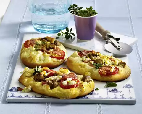 Wash and slice the tomatoes. Open the dough tin, take out the dough and place 2 pieces of dough on top of each other. Roll out oval on some flour (approx. 15 cm long) and place on a baking tray lined with baking paper.