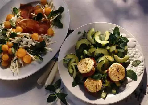 Pluck the mint leaves from the stalks. Mix oil, lemon juice and vinegar. Season with salt and pepper. Mix cucumber and mint leaves with the vinaigrette. Arrange slices of bread on top of the vinaigrette.