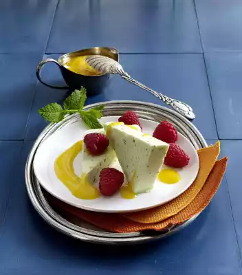 Beat the egg yolks, sugar syrup and mint syrup with the whisk of the hand mixer until the mixture has a creamy consistency. Whip cream until half stiff. Beat the egg whites until stiff, adding 30 g sugar. Fold the yoghurt, cream and beaten egg white into the egg yolk mixture. Line a box form (approx. 1.2 litres capacity) with foil. Fill the parfait mass into the mould, smooth it down, cover with foil and put it in the freezer for at least 4 hours. Peel the mango, cut the flesh from the stone and dice roughly. Puree mango, lemon juice, apple juice and 1 tbsp. sugar very finely. Select the raspberries.