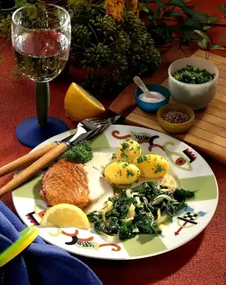 Fry the escalopes in oil on both sides for about 1 minute, season with salt, pepper and paprika and remove from the pan. Heat milk and gorgonzola in the frying fat and season with salt and pepper. Arrange the schnitzel with spinach, sauce and lemon wedge. Serve with boiled potatoes sprinkled with parsley