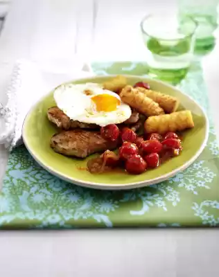 In a pan, fry the onion cubes in the frying fat for about 5 minutes until translucent. After about 3 minutes add tomatoes. Deglaze with stock, bring to the boil, season to taste with salt, pepper and vinegar. Meanwhile melt the fat in the second pan, beat the eggs in it and fry them. Season with salt and paprika. Arrange steaks, tomatoes, croquettes and eggs
