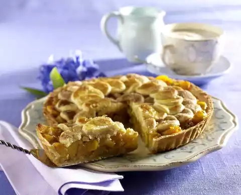 Stir in the pudding powder. Simmer for about 1 minute while stirring. Mix in the mirabelles, bring to the boil and remove from the heat. Leave to cool. Roll out half of the dough on a floured work surface until round (approx. 26 cm Ø). Grease a tart tin (bottom 20 cm Ø; top 24 cm ). Line it with the dough, press it down, cut off any protruding edges. Spread the roasted almonds on the base, chill. Roll out the remaining dough. Cut out round biscuits (approx. 3 cm). Mix 2 tablespoons sugar and cinnamon. Whisk egg yolk and milk. Spread the biscuits with it.