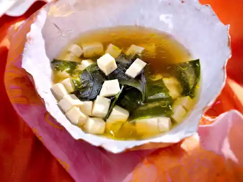 Bring the dashi broth to the boil, add the wakame and tofu, bring to the boil again briefly. Stir the miso paste with some hot broth until smooth and add it to the remaining broth, but do not boil any more. Season miso soup to taste with a little pepper, arrange in bowls, sprinkle with chives and drizzle with oil. Basmati rice tastes good with it