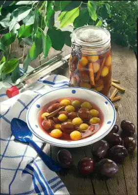 Hull and wash the yellow plums. Wash, halve and stone plums. Layer the fruit in preserving jars. Bring 1 litre of water, sugar and cinnamon sticks to the boil, allow to cool and pour over the fruit and close. Put the glasses on the insert and boil down in the stew pot at 80°C for about 30 minutes