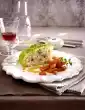 Mix cream cheese, garlic and parsley until smooth. Season with salt and pepper. Mix vinegar and lemon juice. Season with salt, pepper and sugar. Gradually add the walnut oil. Clean, wash and slice the radicchio.