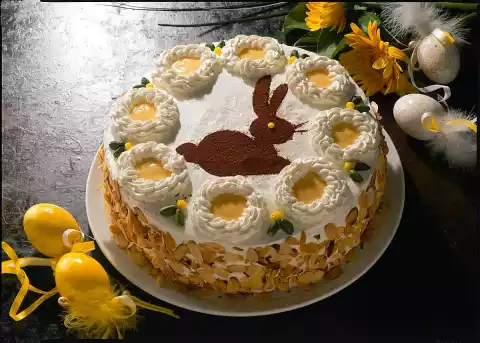 Decorate with pistachios and pearls. Carefully place a rabbit cutter on the cake and dust in the cocoa. Remove the mould. Makes about 16 pieces.