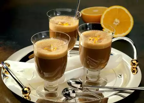 Go through everything again briefly. Pour the mocha-orange punch into 4 ovenproof glasses and decorate with orange peel.