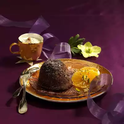 Carefully fold in chocolate mixture. Sift the flour over it and stir in carefully. Pour the mixture into the moulds. Chill for at least 1 hour (maximum 24 hours). Peel and slice the clementines. Chop the pistachios and sprinkle over them. Mix sugar syrup and liqueur and pour over. Chill for 1-2 hours. Bake the mocha pudding in a preheated oven (electric cooker: 200 °C/ convection oven: 175 °C/ gas: level 3) for 12-15 minutes. The pudding is ready when it has risen slightly and shows fine cracks on the surface.