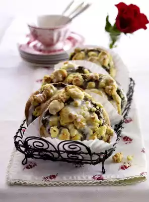 Add 75 g fat, lukewarm milk, 75 g sugar and 1 pinch of salt to the pre-dough and knead with the dough hooks of the hand mixer to a smooth dough. Cover the dough and let it rise for another 45-60 minutes. For the crumbles 300 g flour, 150 g sugar, 175 g fat in flakes, egg, ##orange## peel and 1 pinch of salt first with the dough hooks of the hand mixer, then knead with your hands to crumbles. Mix the poppy seed filling, 75 g sugar, sauce powder and quark. Form ##yeast dough## into a roll (approx. 6 cm Ø) on a floured work surface and cut off approx. 16 slices. Form slices into balls and roll out into round flat cakes with a dough roller. Spread ##poppy seed## mass on the flat cakes and smooth it down. Put poppy seed flat cakes on 2 baking trays lined with baking paper. Spread the crumble mixture on the flat cakes. Bake in the preheated oven (electric range: 200 °C/ convection oven: 175 °C/ gas: level 3) for approx. 15 minutes one after the other.