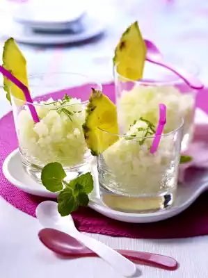 4 Cut the pineapple into small pieces. Divide the granita in glasses, decorate with pineapple and reserved mint.