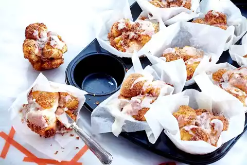 Bake in a hot oven for about 20 minutes. In the meantime stir icing sugar with cream until smooth. Take the muffins out of the oven and immediately sprinkle with the icing. Let them cool down lukewarm.
