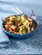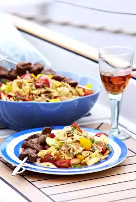 Cook the pasta in boiling salted water according to the instructions on the packet. Quarter the peppers, clean, wash and cut into strips. Halve sausage lengthwise and cut into slices. Peel and clean the cucumber, halve lengthwise and cut into slices. Wash, clean and slice the tomatoes