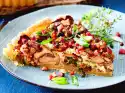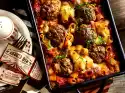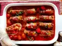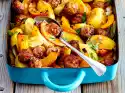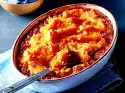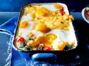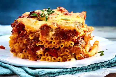 Place about half of the pasta in the mould, preferably pointing in one direction. Spread half of the minced meat ragout on top. Place about 1⁄4 sauce on top, sprinkle 1⁄4 cheese over it. Pour the rest of the noodles, ragout, sauce and cheese on top. Bake in a hot oven for about 45 minutes.