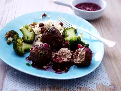 Add meatballs to the sauce and heat. Heat 1 tablespoon of oil in a large frying pan. Fry the broccoli for 4-5 minutes while turning. Season with salt and pepper. Serve everything.