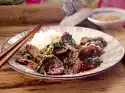 Sauté the remaining onion in the frying fat. Stir in 1 tbsp. sugar, caramelise briefly. Add pomegranate juice and thyme, bring to the boil and simmer for about 1 minute while stirring. Stir starch and 2 tbsp. cold water until smooth.