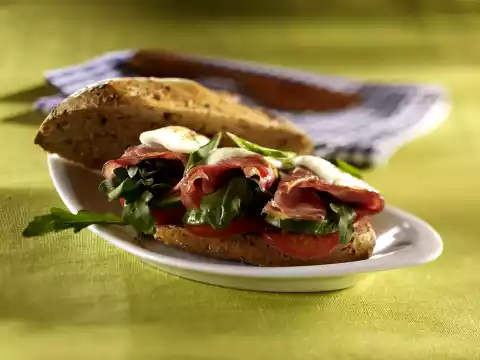 Wash and drain the rocket. Cut the rolls in half. Cover with tomato and cucumber. Fold mortadella slices in half and roll up from the short side, place on the roll and cover with mozzarella.