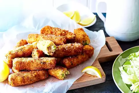 Heat the oil in a wide pot (it is at the right temperature when small bubbles rise from a wooden stick held inside). Fry the sticks in portions, turning them occasionally until golden brown. Remove with a skimmer and let them drip off on kitchen paper. Serve with lemon wedges to drizzle on. Aioli is delicious with it.