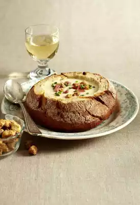 Add the soaked bread mass to the soup and bring to the boil while stirring. Cut ham into strips. Wash chives, shake dry and cut into small rolls. Grate cheese and sprinkle into the soup while stirring. Season soup with salt, pepper and nutmeg. Arrange the soup in the breads and sprinkle with strips of ham, chives and croutons