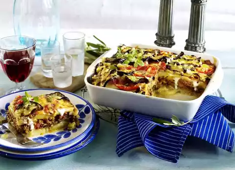 Put the mince evenly on top. Layer remaining potatoes and sauce. Finish with the rest of the eggplant and tomato slices. Sprinkle with parmesan and cook in the preheated oven (electric cooker: 200 °C/ convection oven: 175 °C/ gas: level 3) on the bottom rack for about 30 minutes.