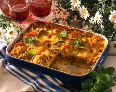 Let it braise for 4-5 minutes. Season with salt, pepper, sugar, cinnamon and paprika. Mix parsley and oregano into the minced meat and remove from the pan. Wash, clean and slice the aubergines, put them on kitchen paper and salt them. Drain the potatoes, rinse with cold water and remove the skin. Cut the potatoes into slices. Heat the rest of the oil in a pan and fry the aubergines in it. Drain on kitchen paper. Clean, wash and slice the tomatoes. Heat the fat in a saucepan, sauté the flour in it and deglaze with milk and broth. Stir in parmesan and season with salt and pepper. Layer potatoes and minced meat in a mould, place aubergines and tomatoes on top in a fan shape and pour sauce over them.