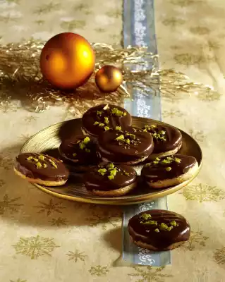 Bake one after the other in a preheated oven (electric cooker: 200 °C/ convection oven: 175 °C/ gas: level 3) for 10-12 minutes. Let them cool down. Chop the couverture, melt with nougat over a warm water bath. Dip about 1/4 of the thaler in the nougat mixture. Drain and put the und dipped side on baking paper. Press a pattern on each thaler with a fork and sprinkle with pistachios, let dry. Store in a cool place
