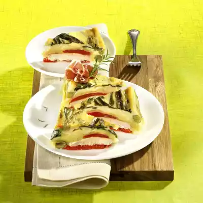 Line the bottom with paprika, sprinkle with some egg milk. Spread chicken fillets on top, fill gaps with olives. Fill the remaining paprika, mozzarella and spring onions into the tin. Pour the rest of the egg milk over it. Bake in the preheated oven (electric cooker: 175 °C/ convection oven: 150 °C/ gas: level 2) for about 1 hour. Leave to rest for approx. 20 minutes, remove from the edge and turn out of the pan. Cut into 6-8 cake pieces. Serve with Parma ham and rosemary sprig