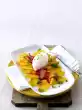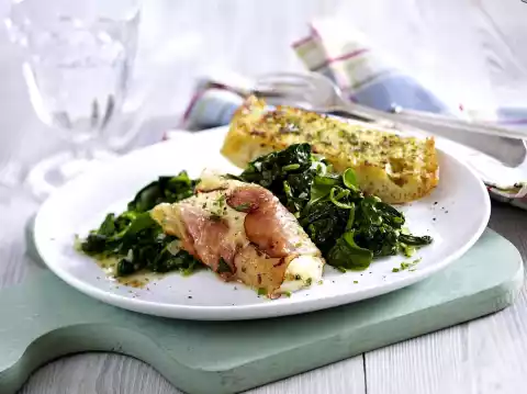 Wash and sort the spinach and let it drain. Peel garlic and onion, dice finely. Drain the mozzarella and season with pepper. Cut in half lengthwise and wrap each piece with a slice of ham