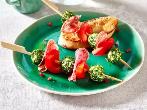 Clean, wash and chop the peppers. Put mozzarella, paprika and salami alternately on wooden skewers. Heat 2 tablespoons of oil in a frying pan and toast bread in it for about 3 minutes while turning. Arrange bread and skewers and sprinkle with 2 tablespoons of oil and sprinkle with pink berries.