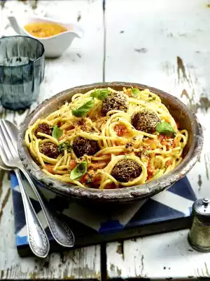 If the pesto is too thick, dilute with a little water. Stir in diced paprika and basil. Drain the pasta, mix with the pesto and serve with the meatballs. Sprinkle with coarse pepper.