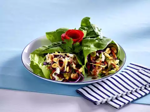 Wash the chives and shake dry. Place lettuce leaves next to each other on the work surface. Spread chicken salad evenly on top. Roll up as wraps and tie each with a chive stalk.
