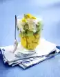 Mix quark, mineral water and 1 tablespoon sugar. Peel and chop the fruit. Mix with lemon juice. Cut the muesli sticks open, spread with quark and sprinkle with maple syrup. Add the fruit