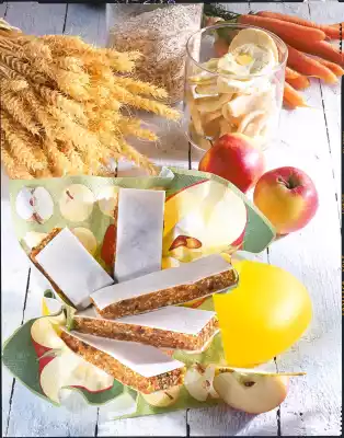 Dice apricots and apple rings very finely. Wash the orange thoroughly with hot water, dab dry and finely grate the skin. Clean, wash and finely grate the carrots. Mix carrots, apple, apricots, orange peel, sesame, nuts, raisins and multi-grain flakes.