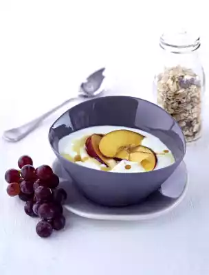 Wash the nectarine, rub dry and cut in half. Remove stone and cut the flesh into thin slices. Wash the grapes, pluck and possibly halve them. Arrange muesli, fruit and yoghurt in a bowl and sprinkle with maple syrup