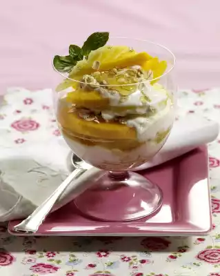 Roast the oat flakes in a pan without fat. Take out and let it cool down. Peel pineapple and mango. Cut into pieces and slices. Layer oat flakes, soured milk, fruit and honey in a glass.
